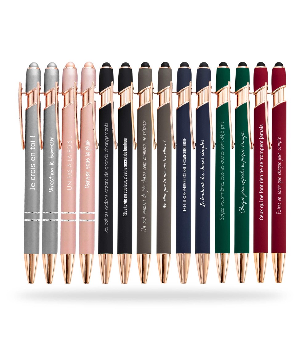 Texte identique pour tous ou personnalisation différente sur chaque stylo (1 à 3 lignes + émojis).